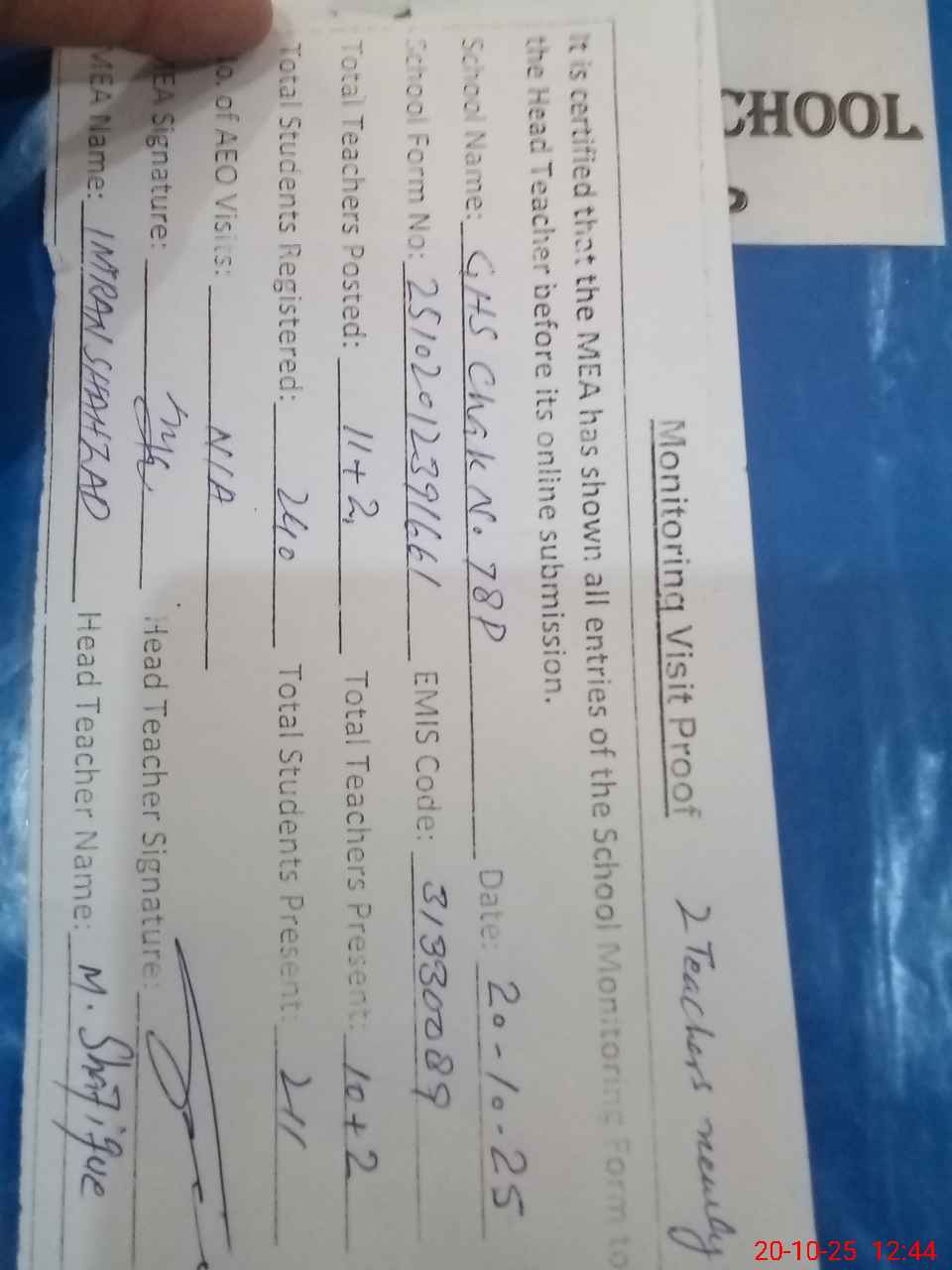 | Attendance Register | Head Teacher | MEA with School | Visit Proof |