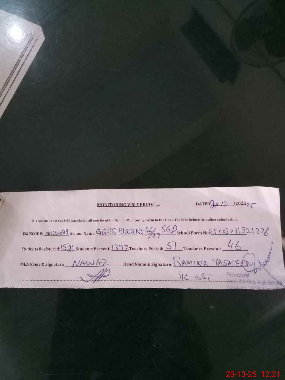 | Attendance Register | Head Teacher | MEA with School | Visit Proof |