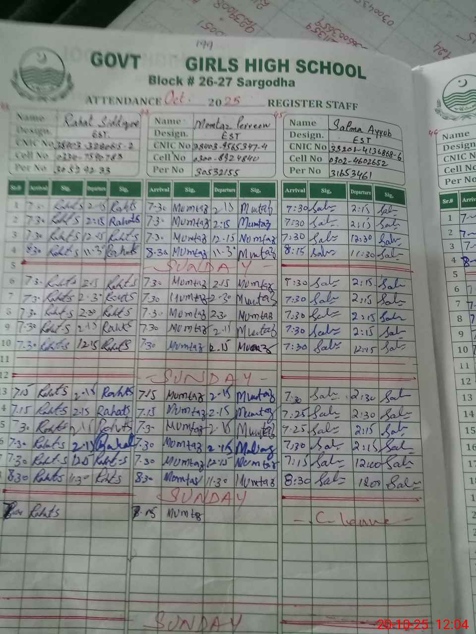 | CNIC | Full Name | Designation | R/C | Absence During Last Calender Month |