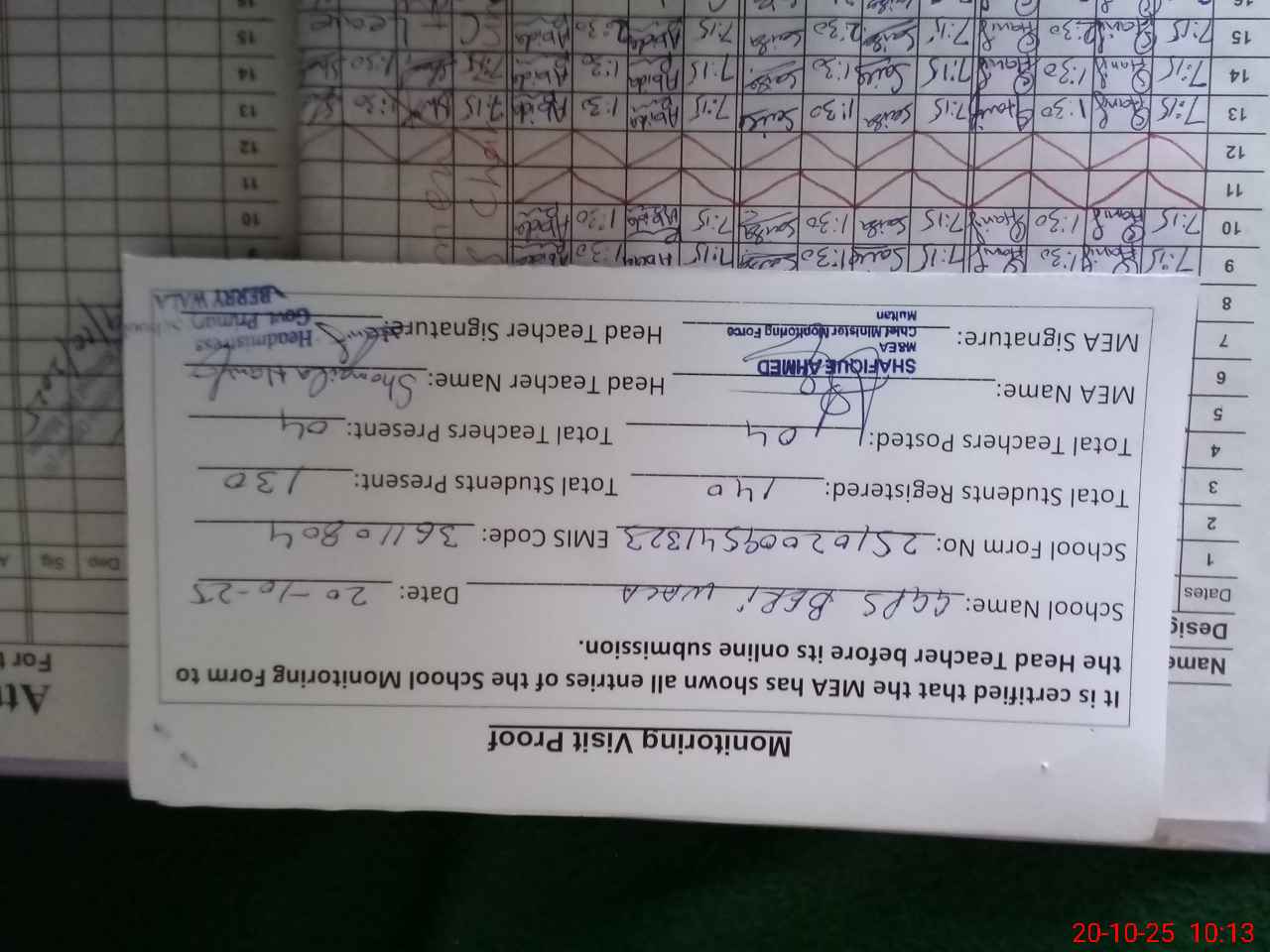 | Monitoring Date: 20-10-2025 | Start Time: 20-10-2025 09:54 AM | End Time: 20-10-2025 10:13 AM | Name of MEA: SH**** AH**** | |