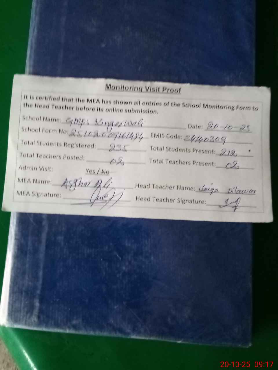 | Attendance Register | Head Teacher | MEA with School | Visit Proof |