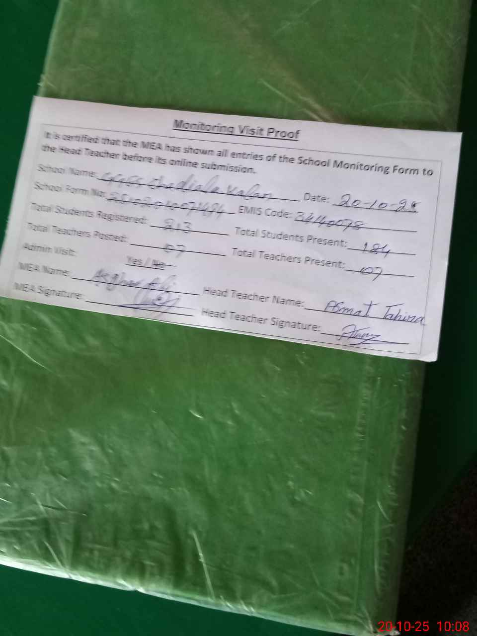 | Attendance Register | Head Teacher | MEA with School | Visit Proof |