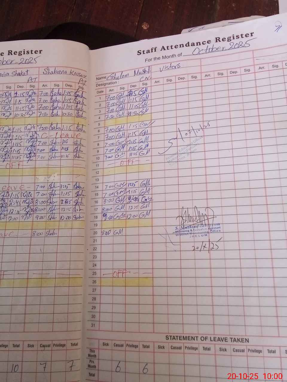 | Remarks (Use Separate Page if Required): HT Farzana Kausar PST is on Ex Pakistan leave for UMRAH I entered the school at 0910 after completion of visit location not fetched message displayed I deleted the data and again same data entered Visit proof is showing actual time of arrival | |||||