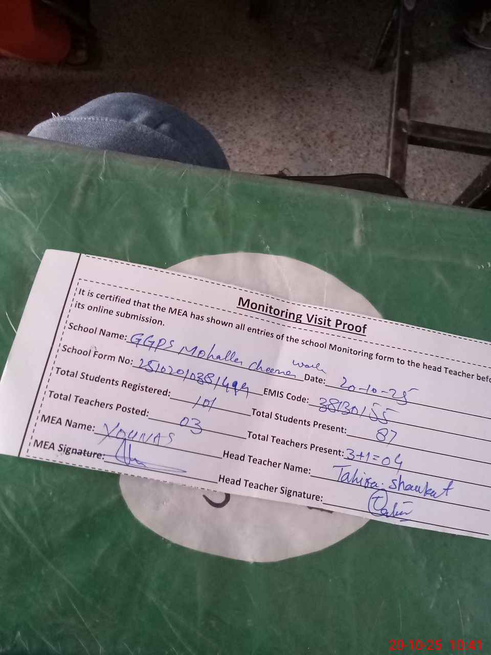 | Attendance Register | Head Teacher | MEA with School | Visit Proof |