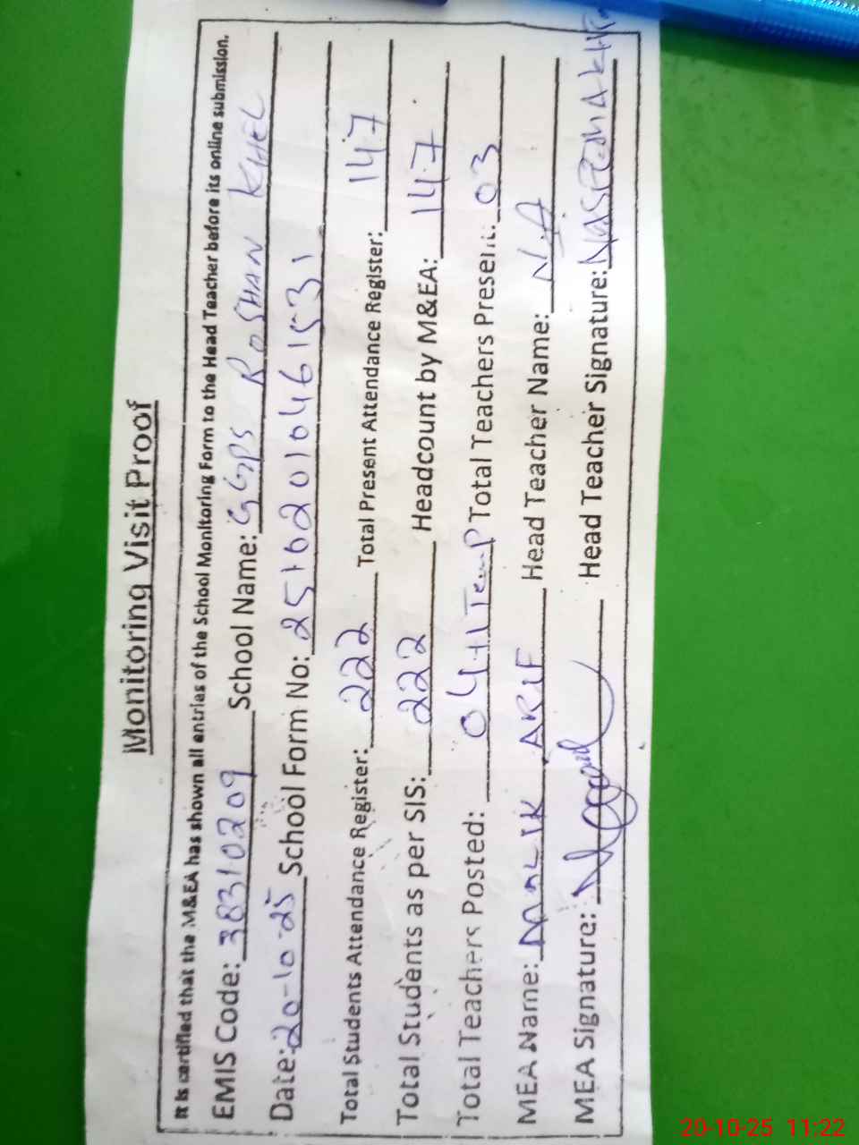 | Attendance Register | Head Teacher | MEA with School | Visit Proof |