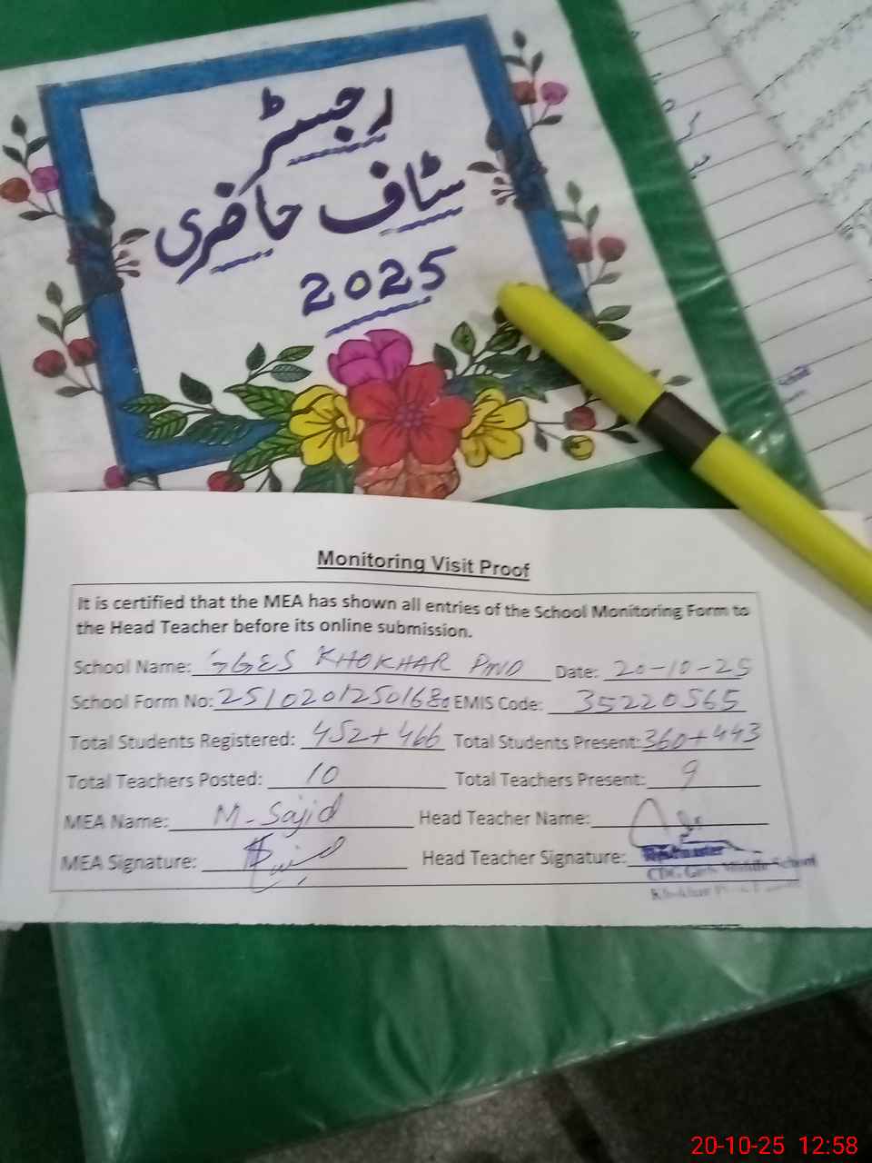 | Attendance Register | Head Teacher | MEA with School | Visit Proof |
