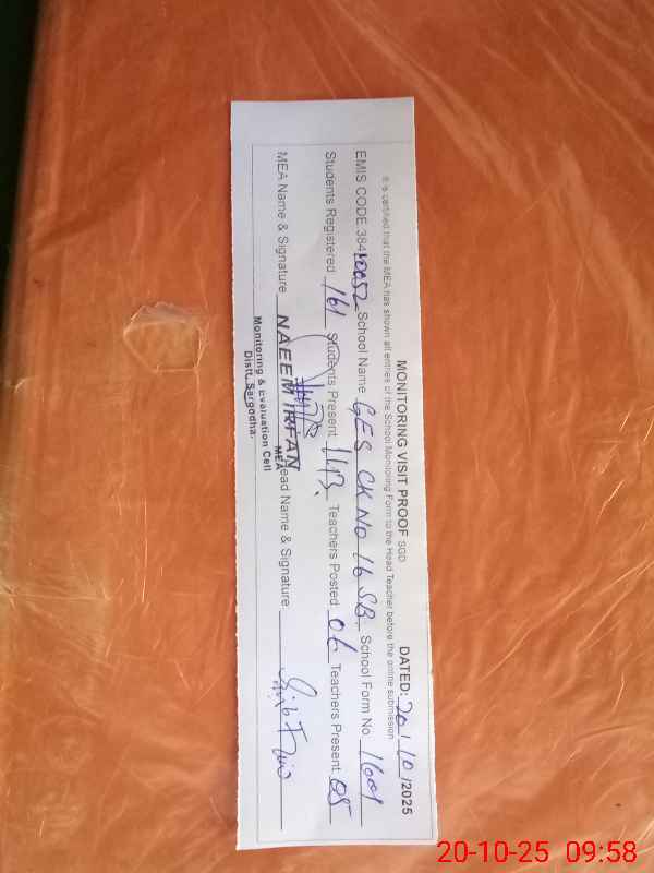 | EMIS Code: 38410052 | Name of School: GES CHAK NO.16 SB | |||