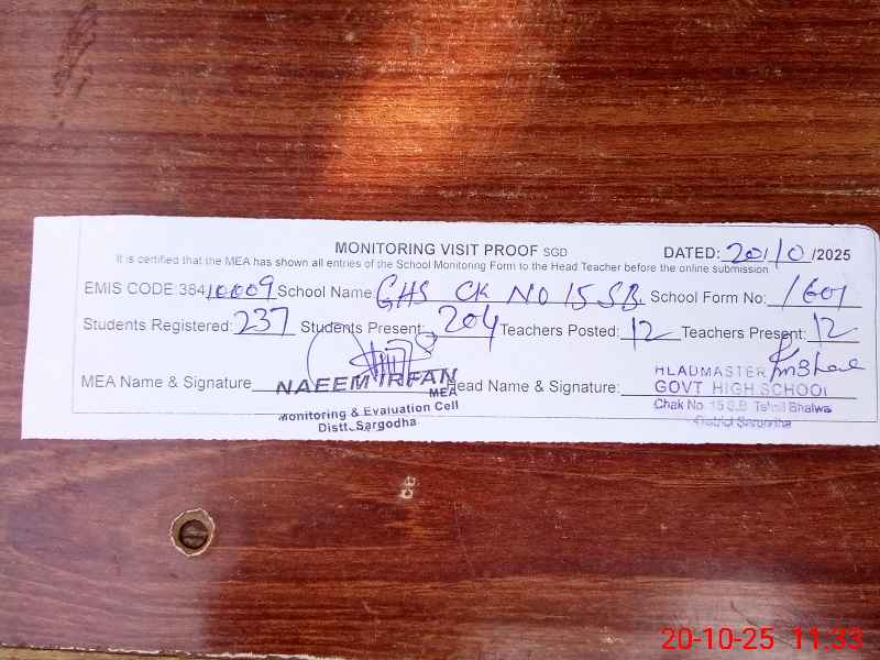 | EMIS Code: 38410009 | Name of School: GHS CHAK NO.15 SB | |||