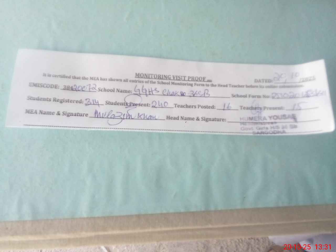 | Attendance Register | Head Teacher | MEA with School | Visit Proof |