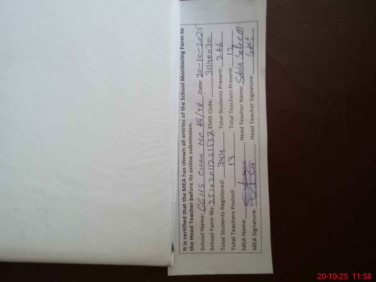 | Certified that this School was Inspected by the Undersigned MEA/DMO Today and the Information Stated Above is as Per Record. | |||||