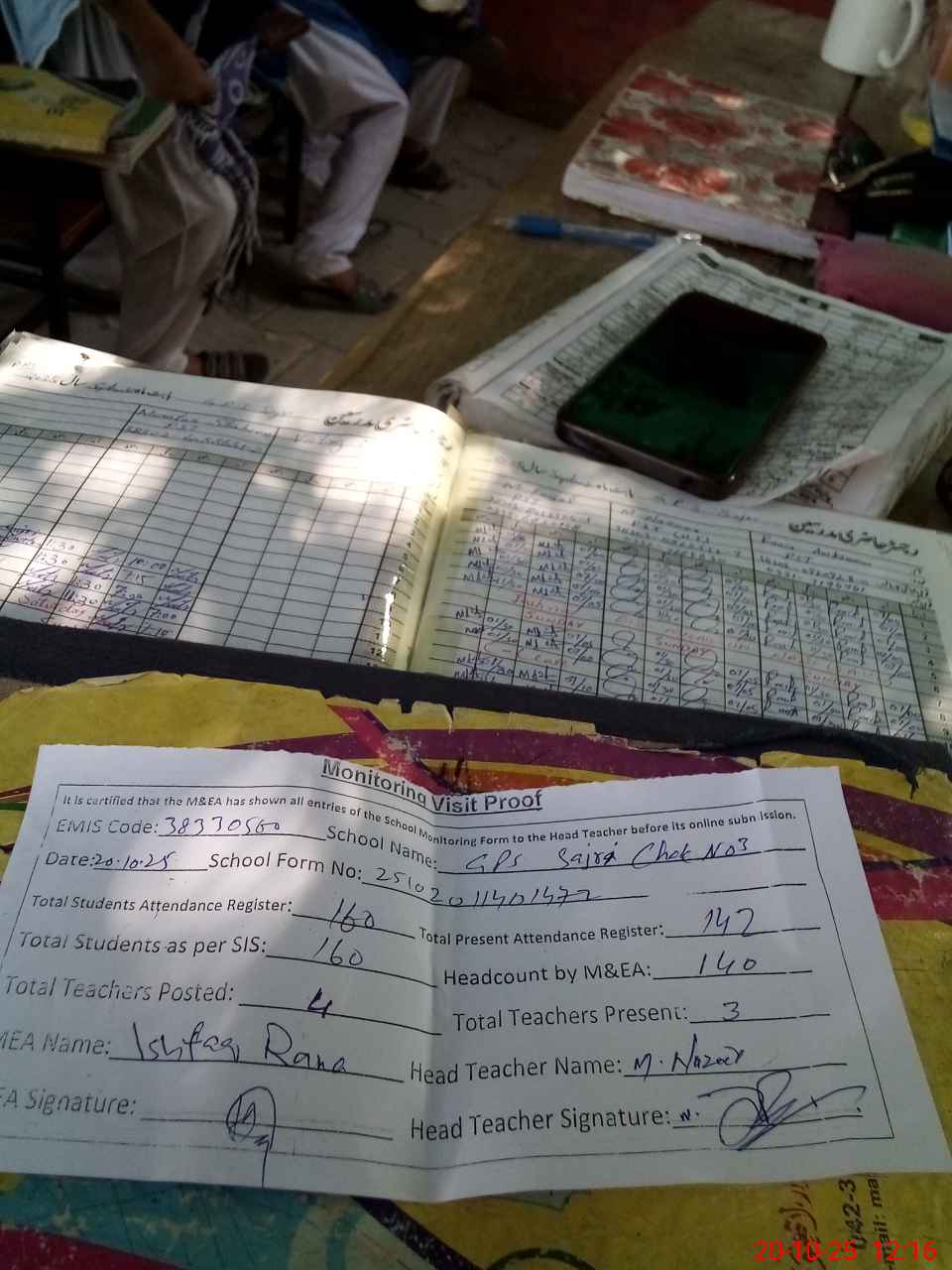 | Attendance Register | Head Teacher | MEA with School | Visit Proof |