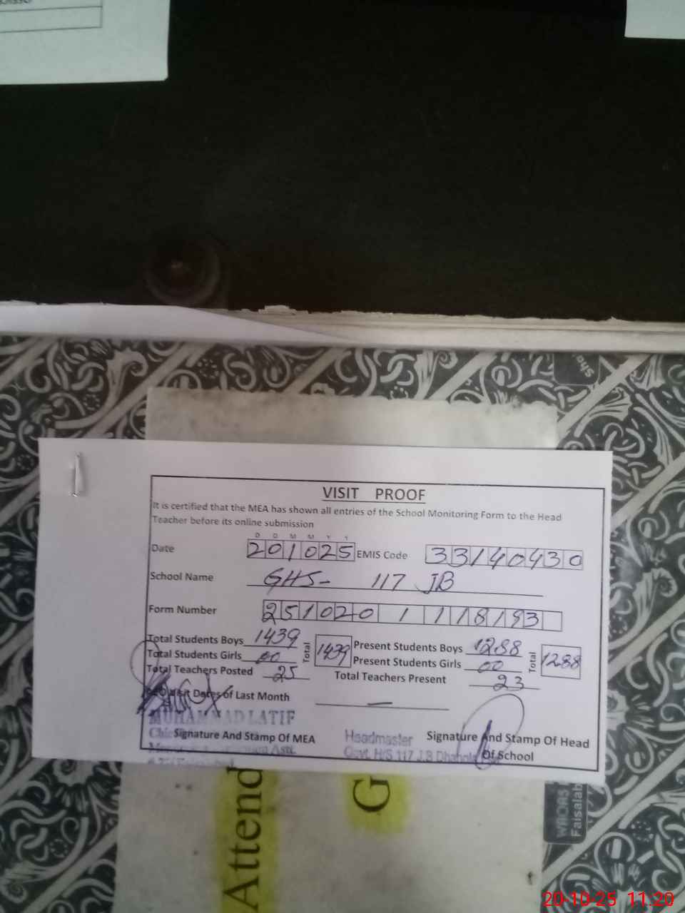 | Attendance Register | Head Teacher | MEA with School | Visit Proof |