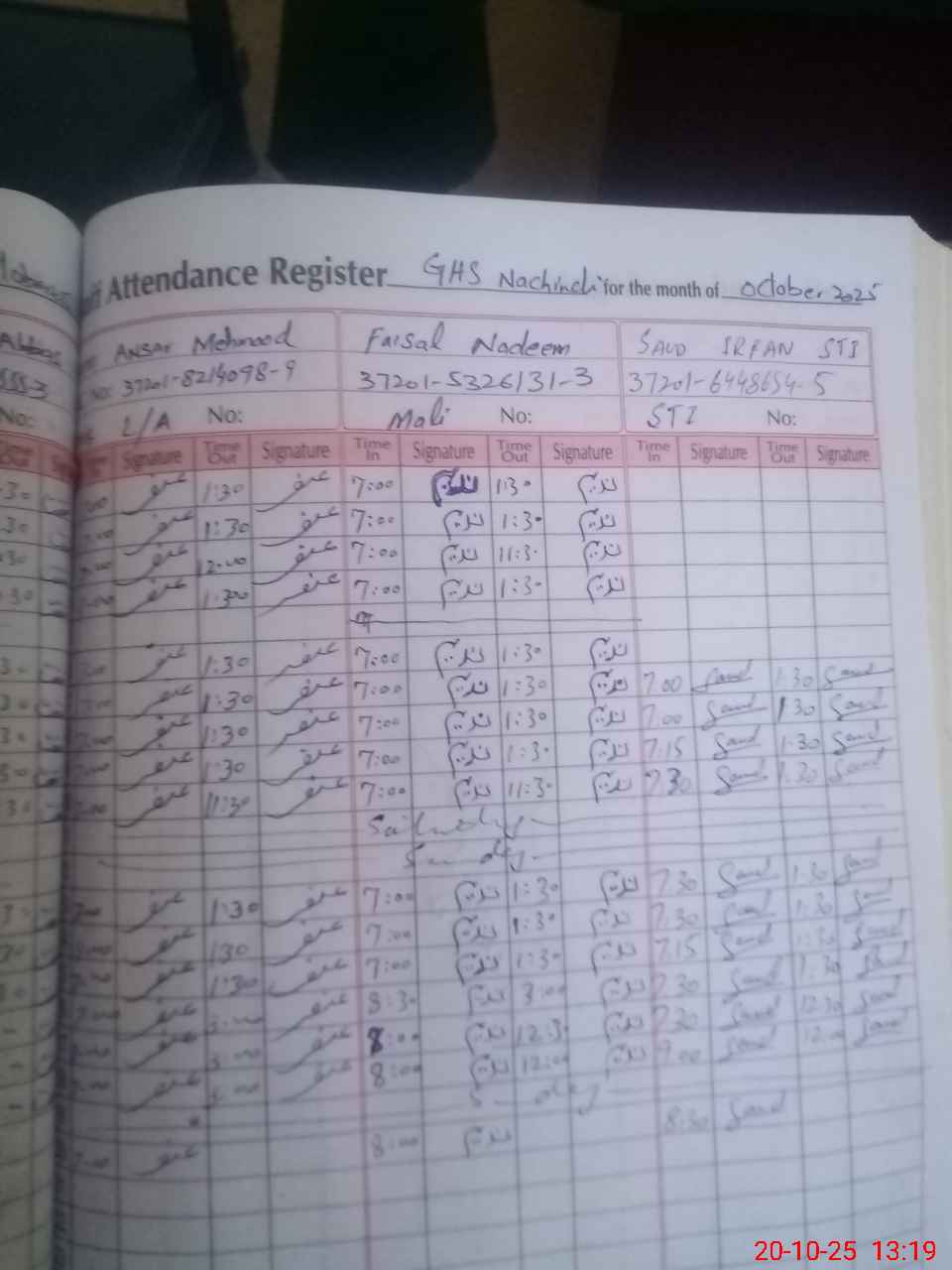 | CNIC | Full Name | Designation | R/C | Absence during last cal. month |