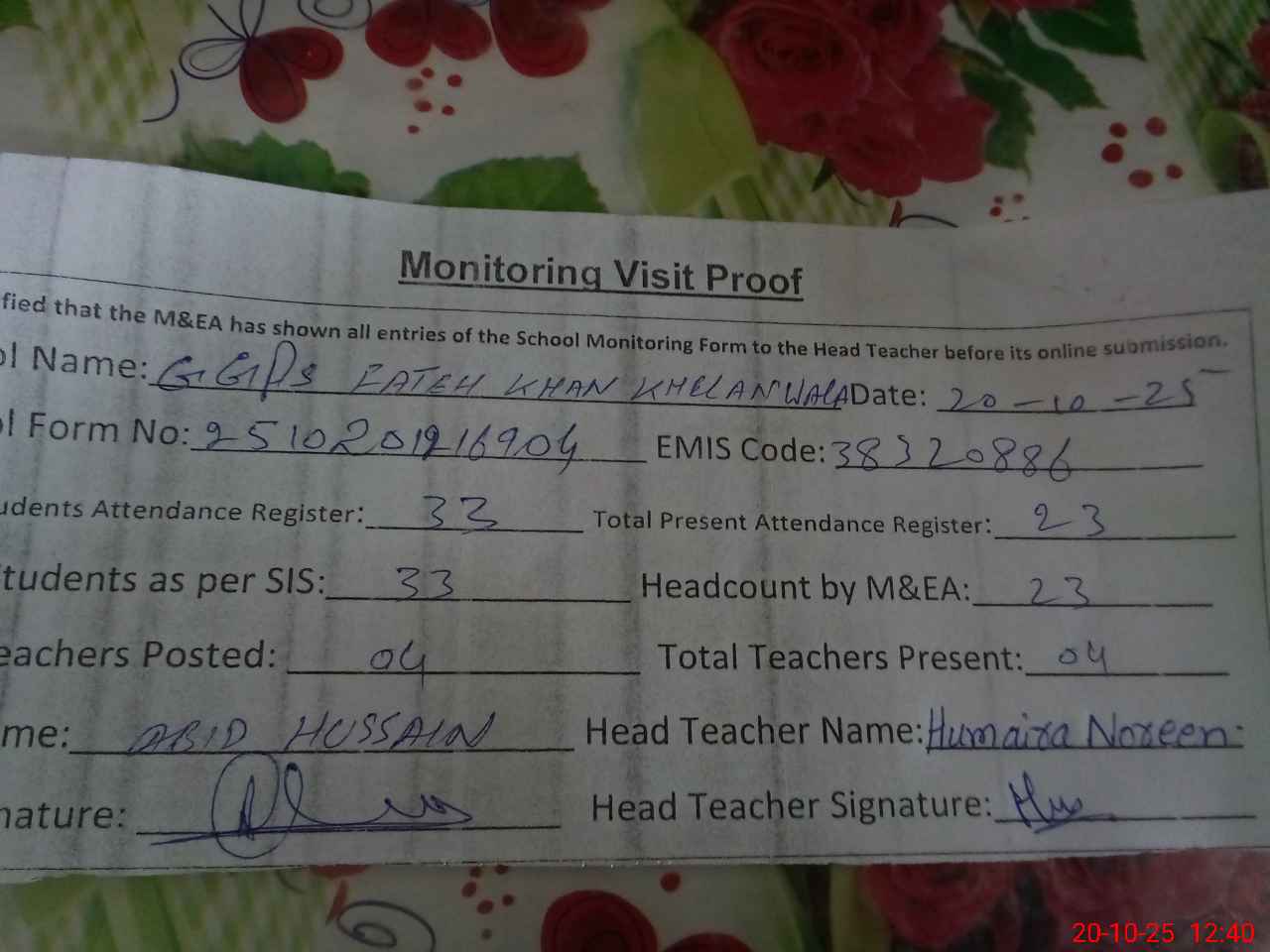| Attendance Register | Head Teacher | MEA with School | Visit Proof |
