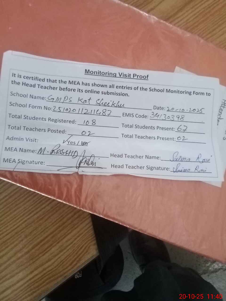 | EMIS Code: 34130398 | Name of School: GMPS KOT SHEIKHU | |||