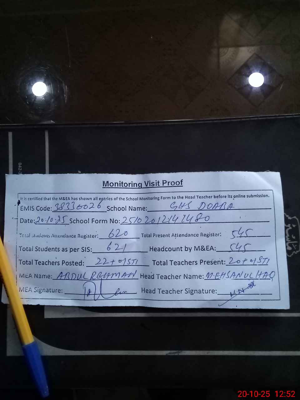 | Attendance Register | Head Teacher | MEA with School | Visit Proof |