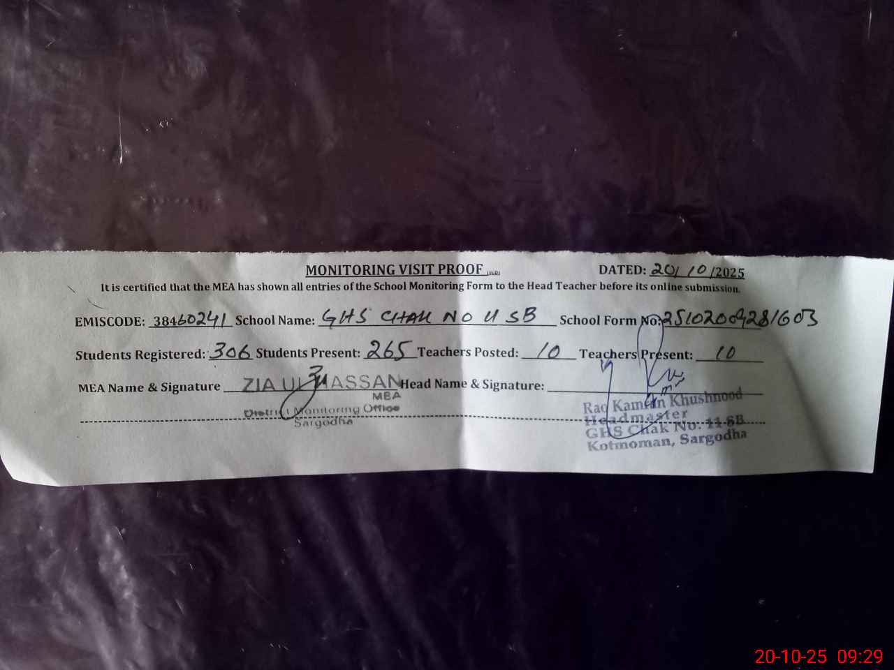 | Monitoring Date: 20-10-2025 | Start Time: 20-10-2025 09:05 AM | End Time: 20-10-2025 09:30 AM | Name of MEA: ZI**** ULHA**** | |