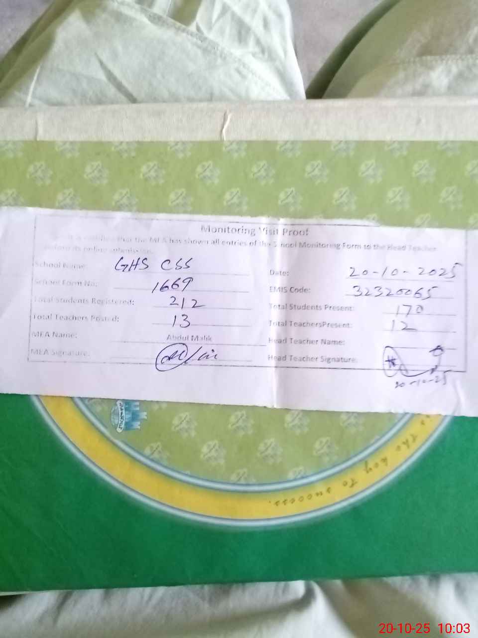 | EMIS Code: 32320065 | Name of School: GHS CHOWK SARWAR SHAHEED | |||