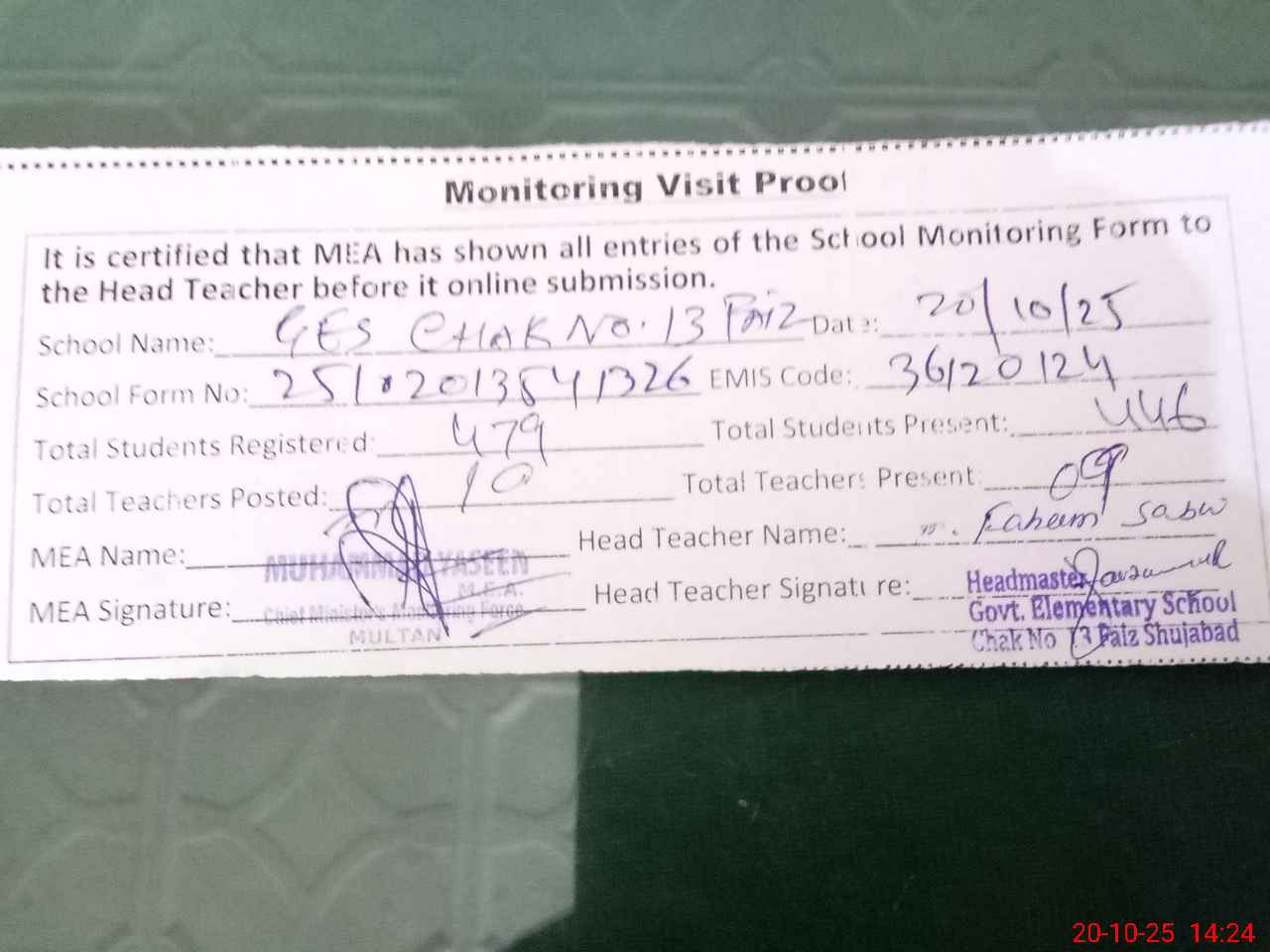 | Attendance Register | Head Teacher | MEA with School | Visit Proof |