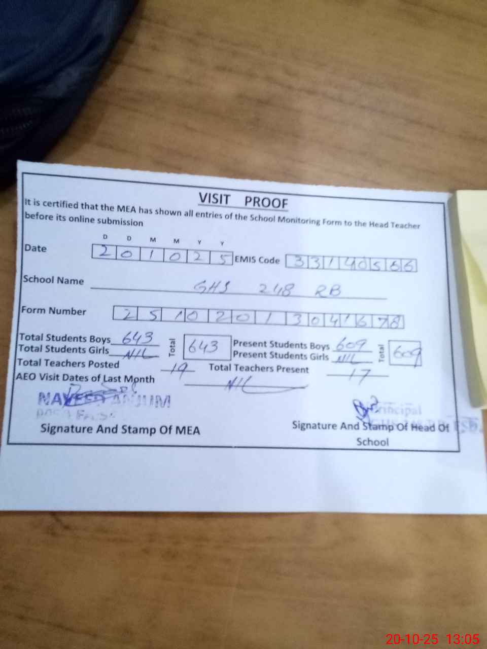 | Certified that this School was Inspected by the Undersigned MEA/DMO Today and the Information Stated Above is as Per Record. | |||||