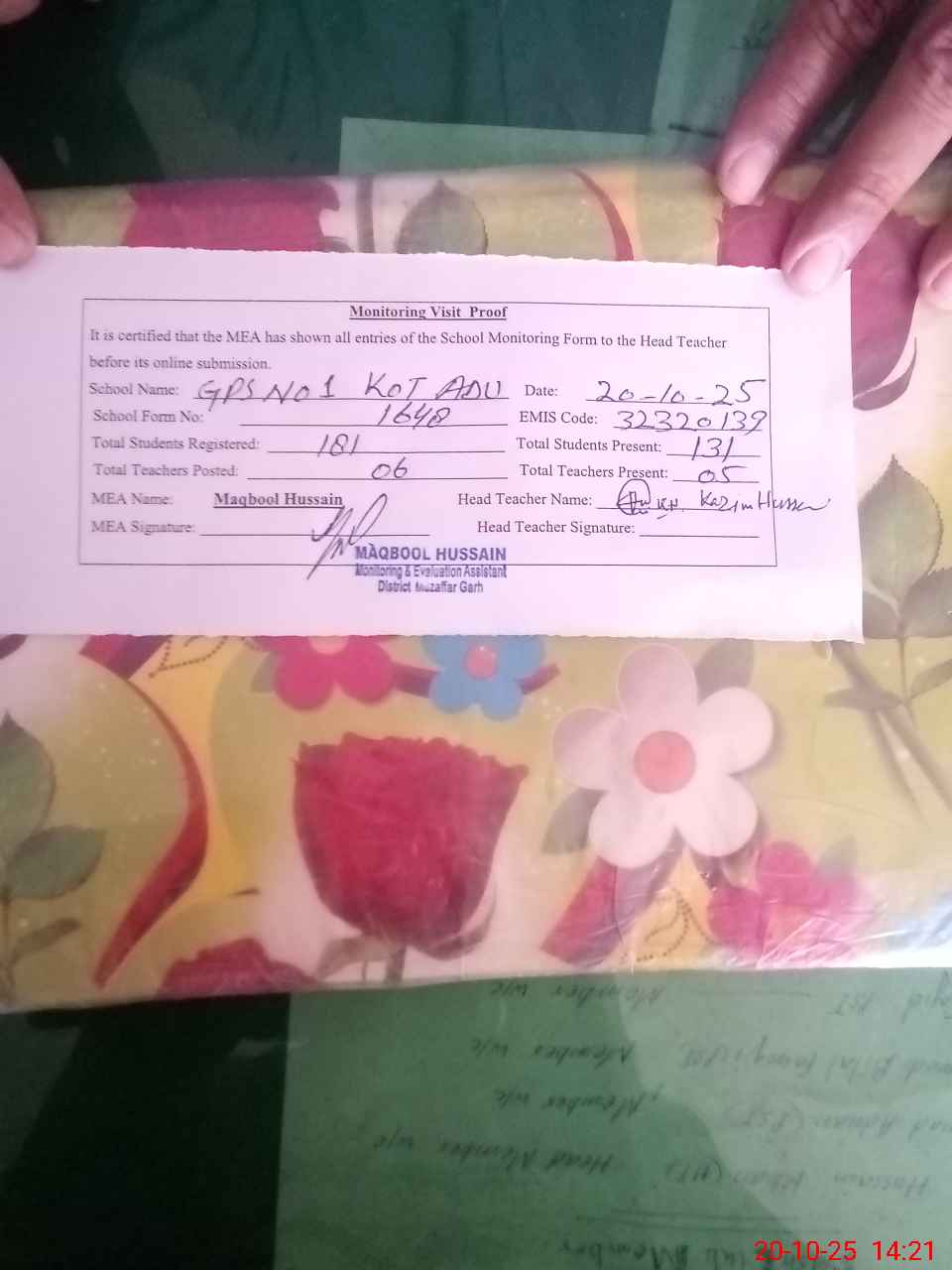 | EMIS Code: 32320139 | Name of School: GPS KOT ADU NO. 1 | |||