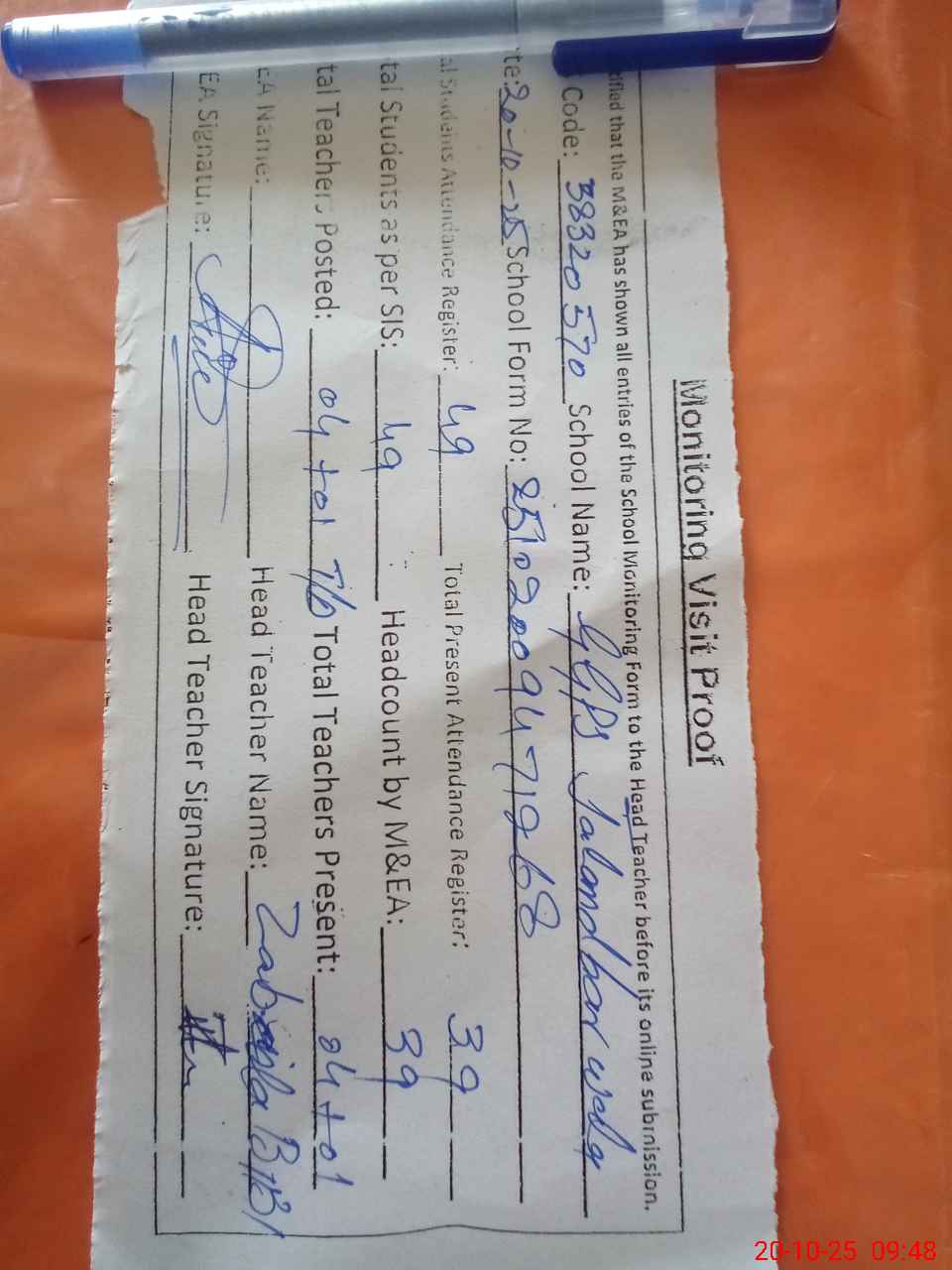 | Attendance Register | Head Teacher | MEA with School | Visit Proof |
