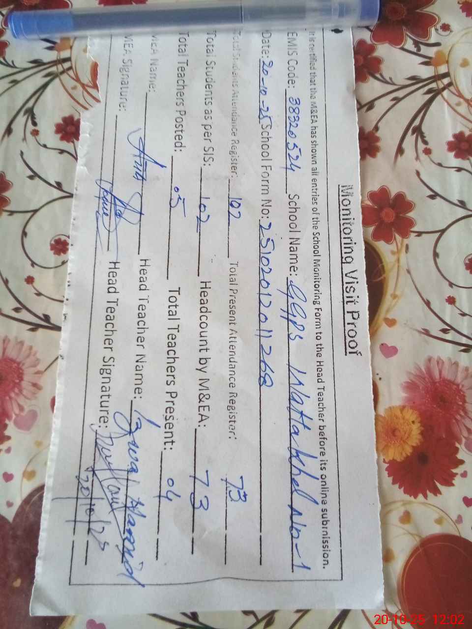 | Attendance Register | Head Teacher | MEA with School | Visit Proof |