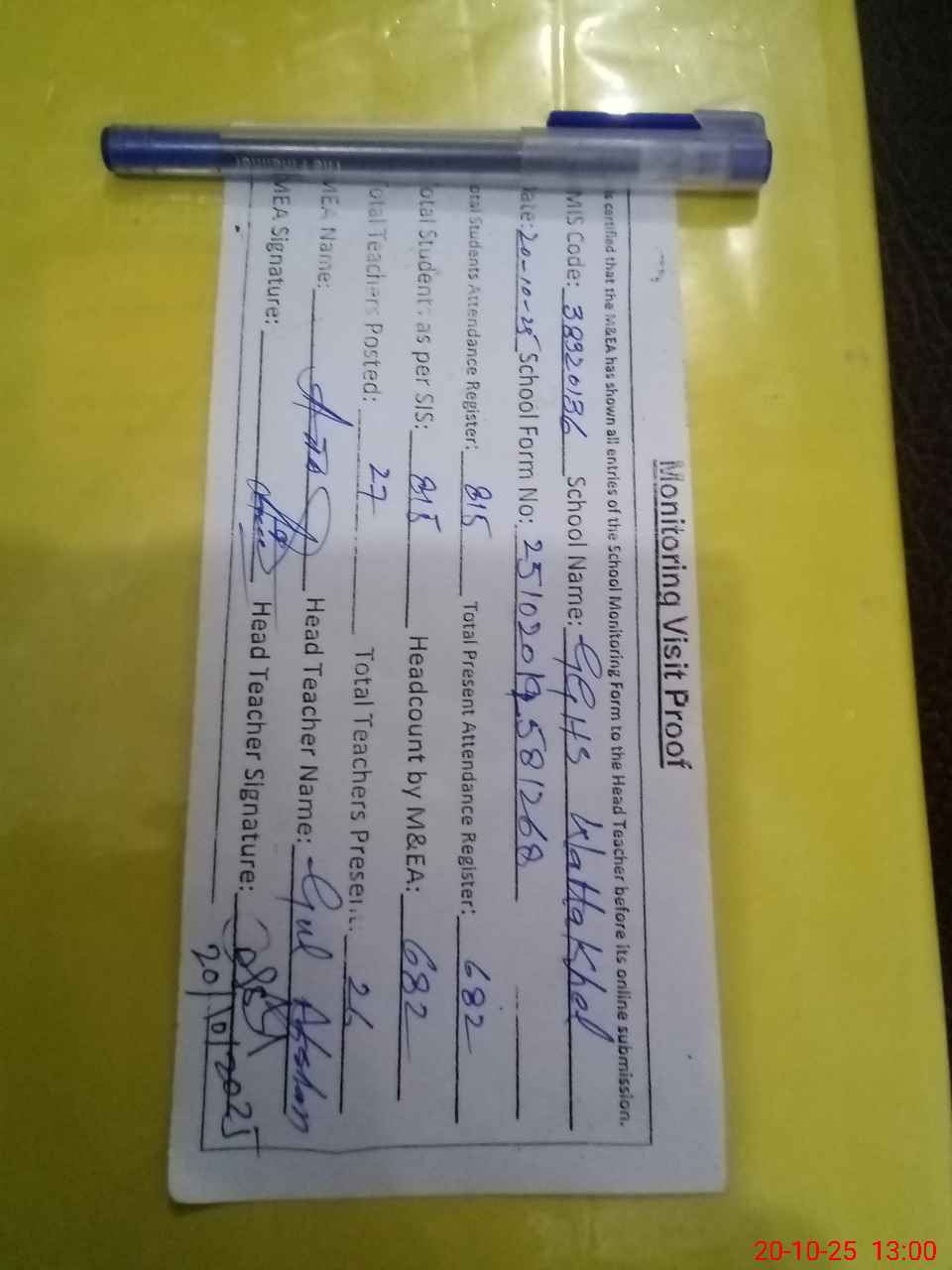| Attendance Register | Head Teacher | MEA with School | Visit Proof |
