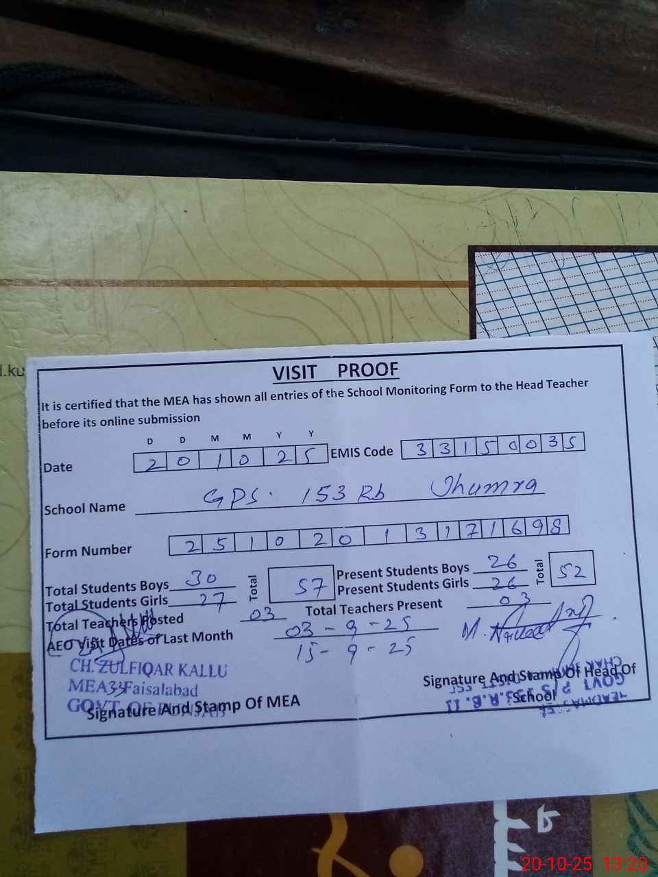 | Attendance Register | Head Teacher | MEA with School | Visit Proof |