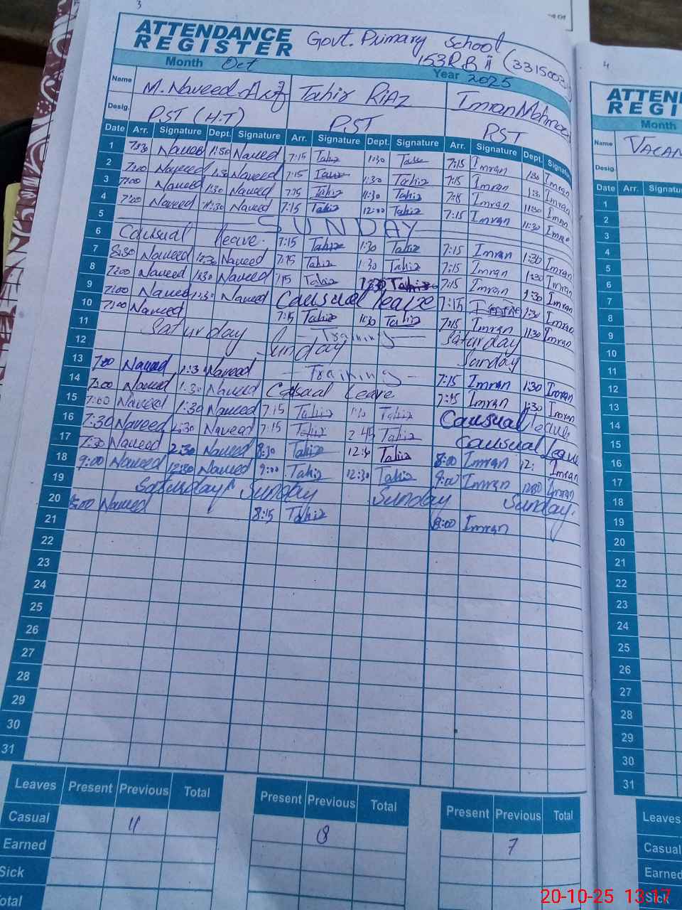 | CNIC | Full Name | Designation | R/C | Absence During Last Calender Month |