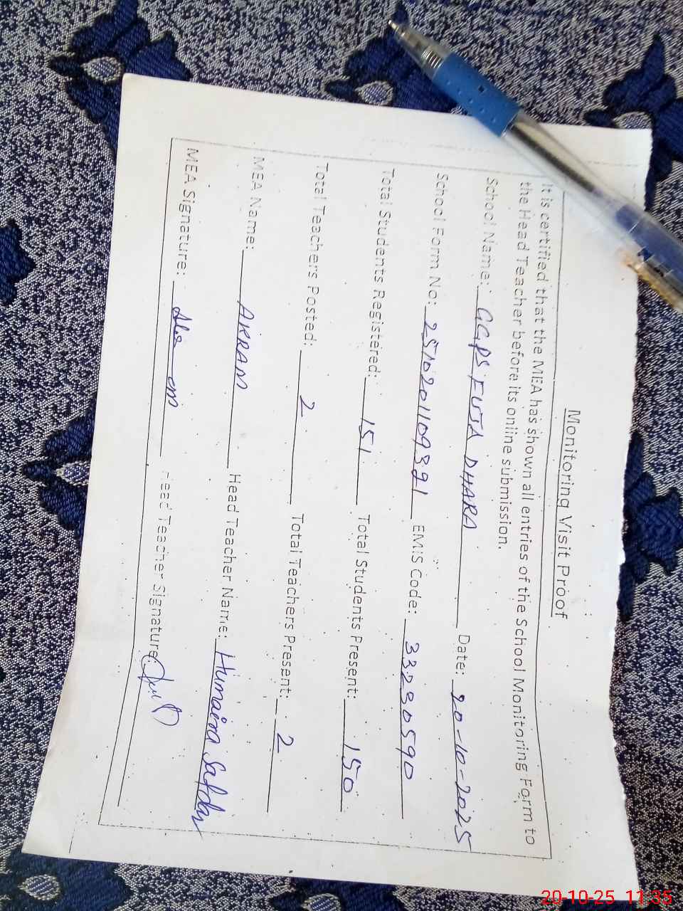 | Certified that this School was Inspected by the Undersigned MEA/DMO Today and the Information Stated Above is as Per Record. | |||||