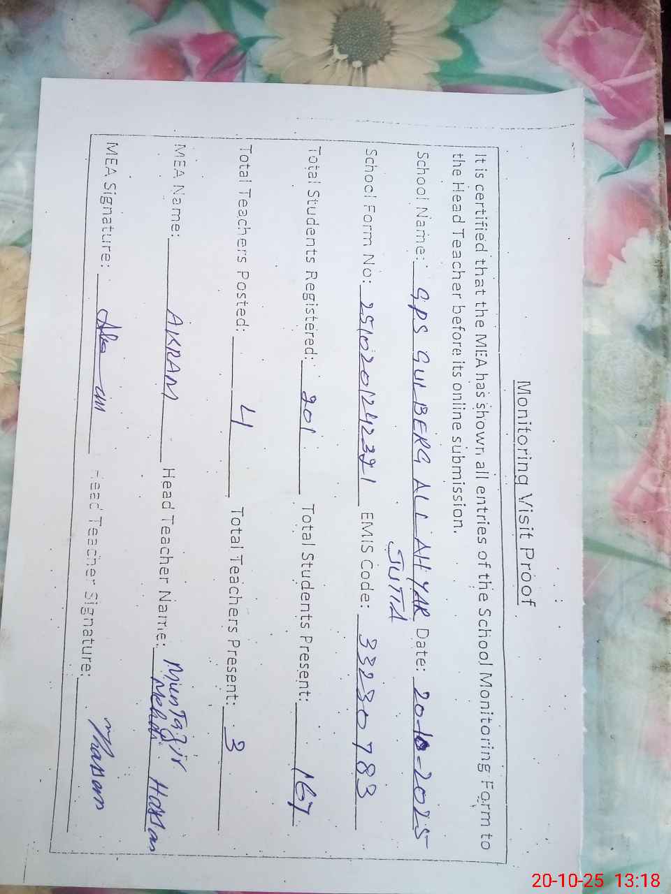 | EMIS Code: 33230783 | Name of School: GPS GULBERG ALLAH YAR JUTA | |||
