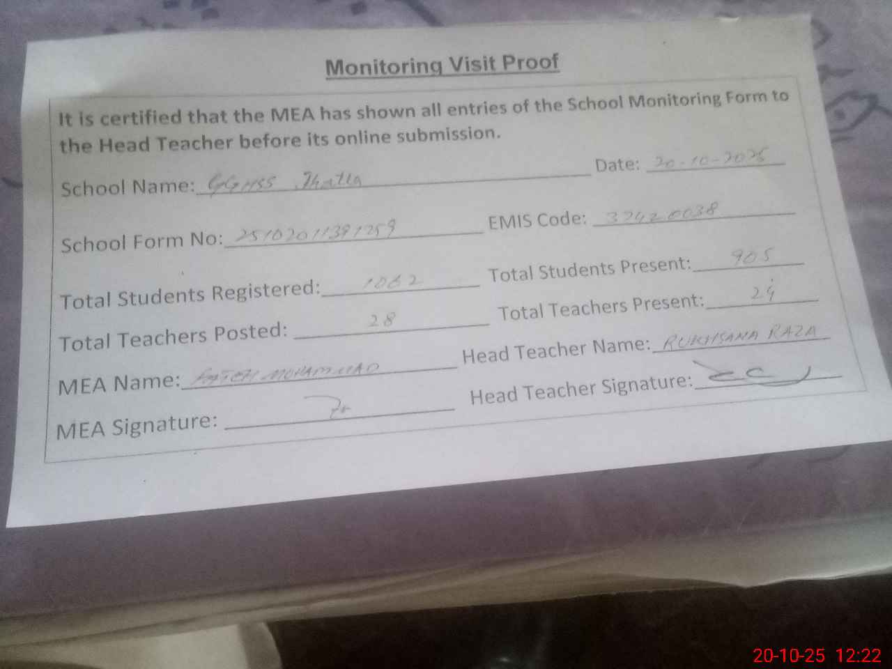 | Certified that this School was Inspected by the Undersigned MEA/DMO Today and the Information Stated Above is as Per Record. | |||||