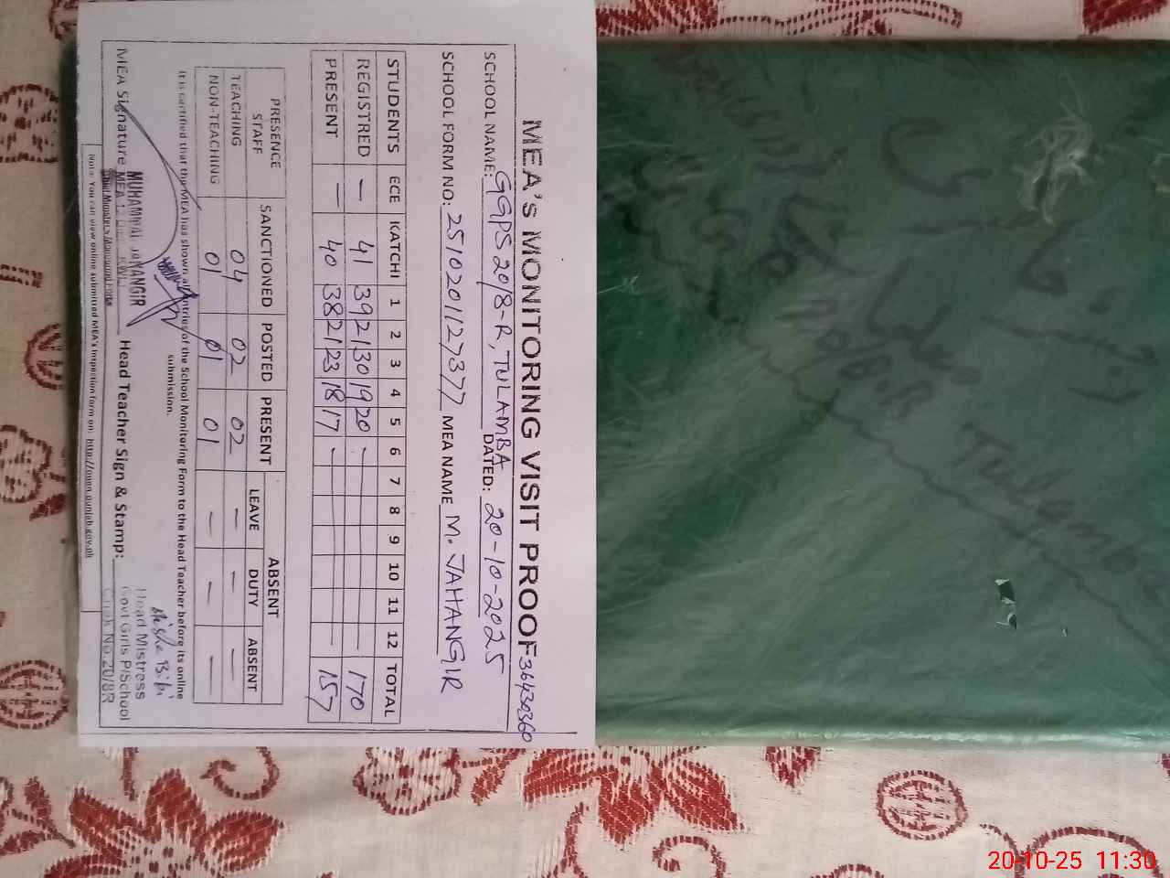 | Attendance Register | Head Teacher | MEA with School | Visit Proof |