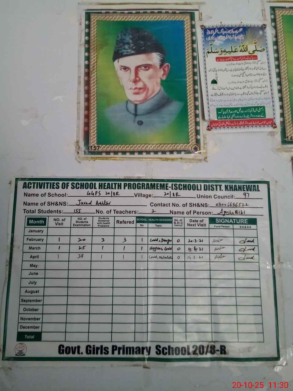 | School Visited by School Health & Nutrition Supervisor (No. of Visits) | Name1: | JAVED AKHTAR | Name2: | ||