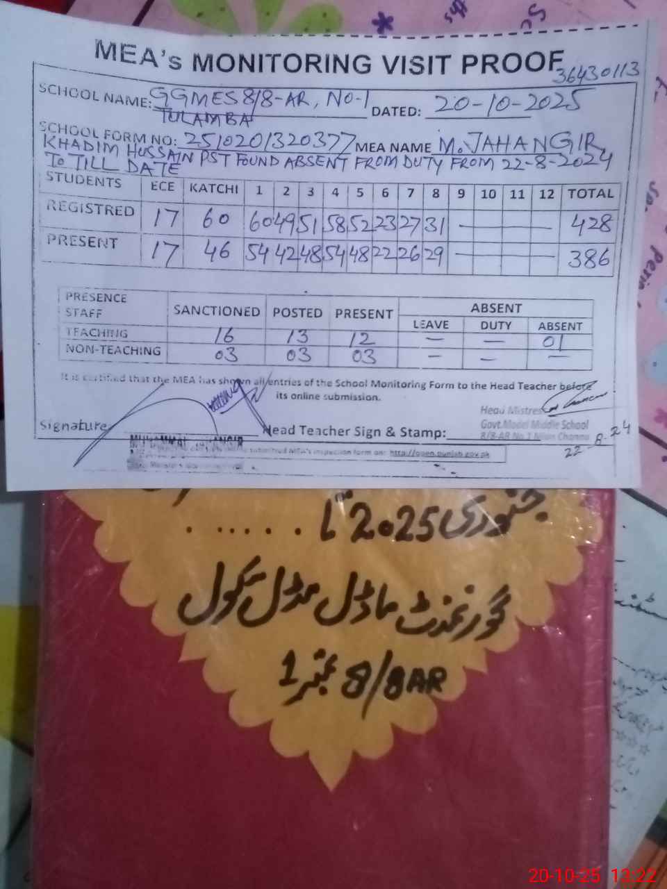 | Attendance Register | Head Teacher | MEA with School | Visit Proof |
