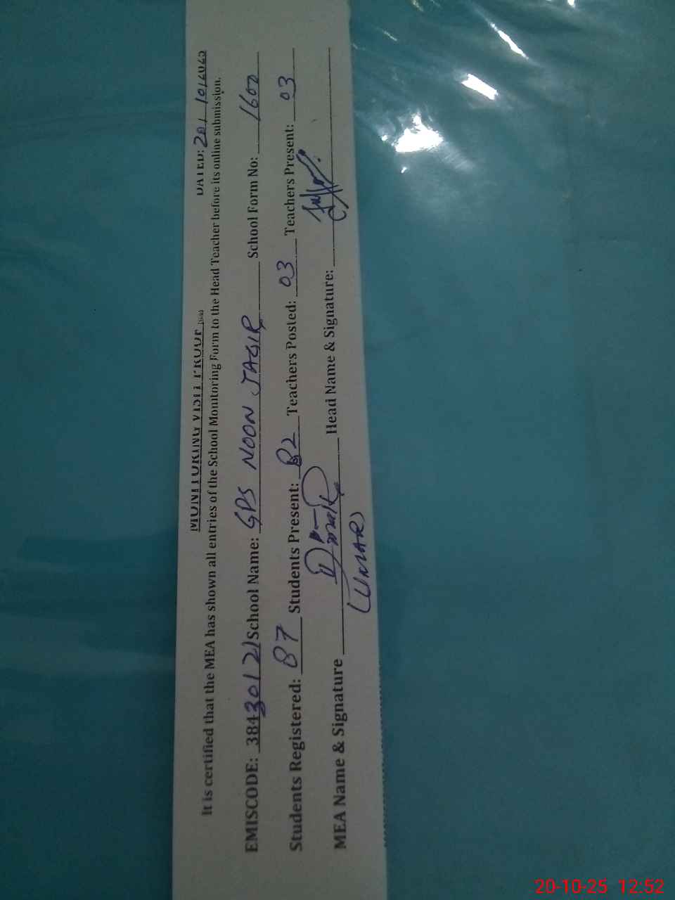 | Attendance Register | Head Teacher | MEA with School | Visit Proof |