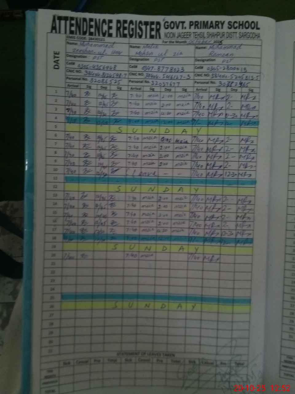 | CNIC | Full Name | Designation | R/C | Absence during last cal. month |