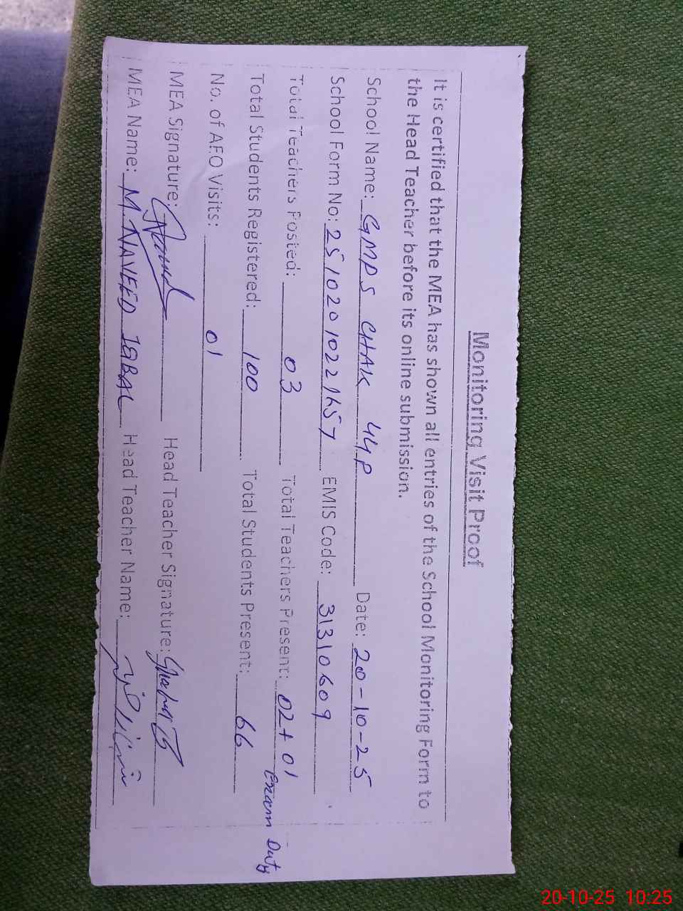 | Attendance Register | Head Teacher | MEA with School | Visit Proof |