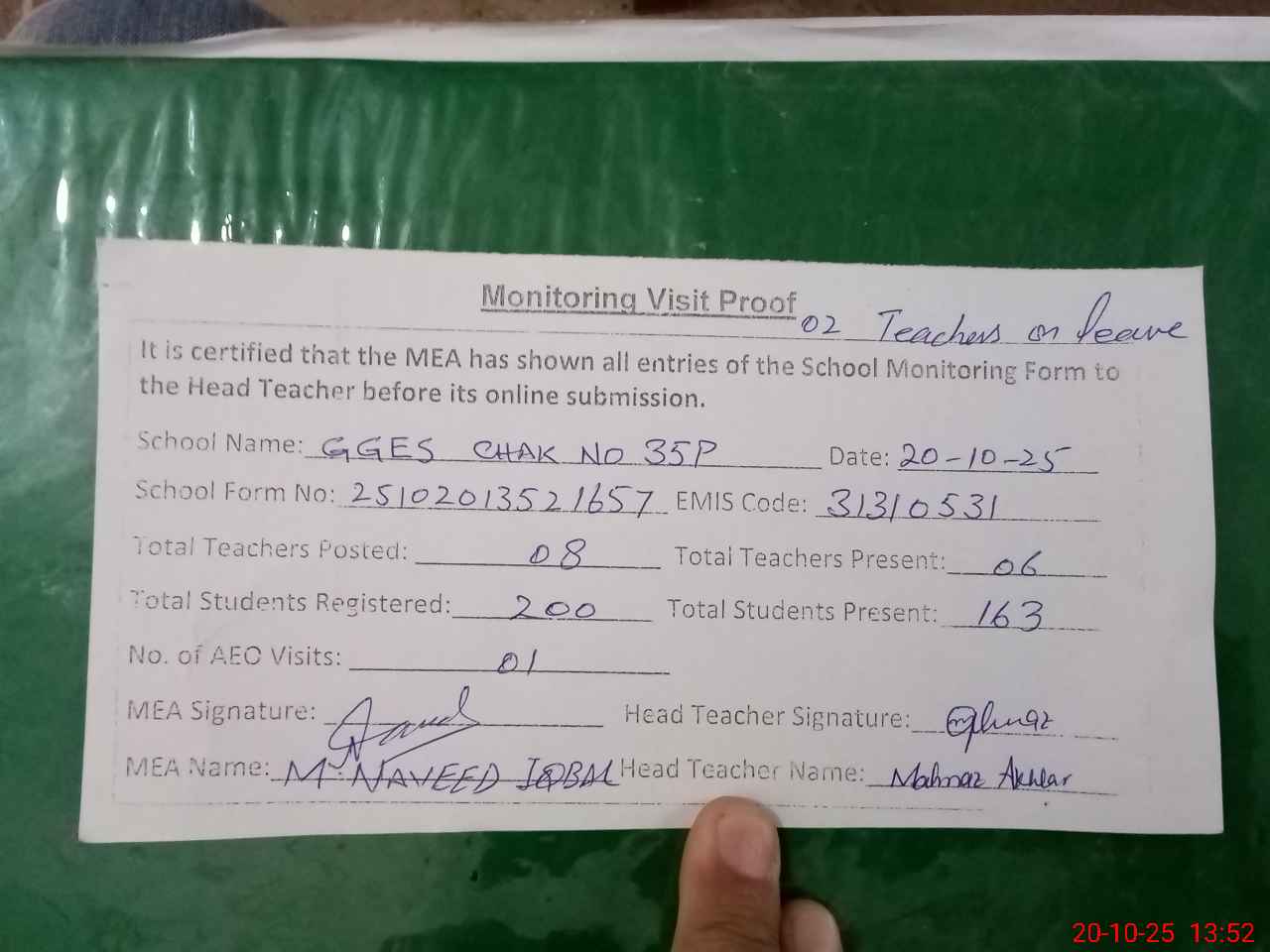 | Attendance Register | Head Teacher | MEA with School | Visit Proof |