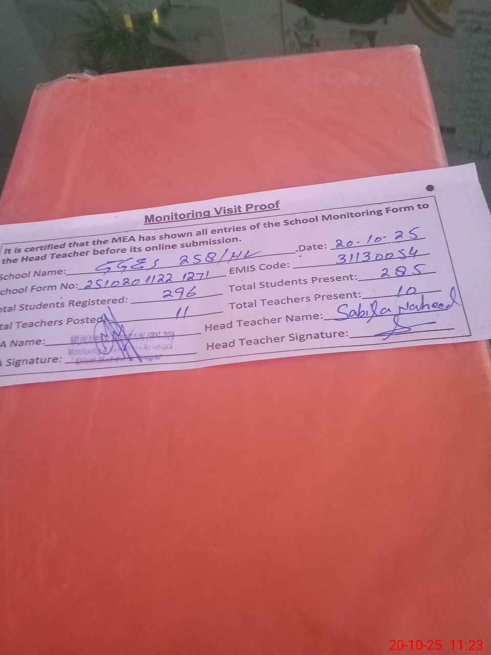 | Attendance Register | Head Teacher | MEA with School | Visit Proof |