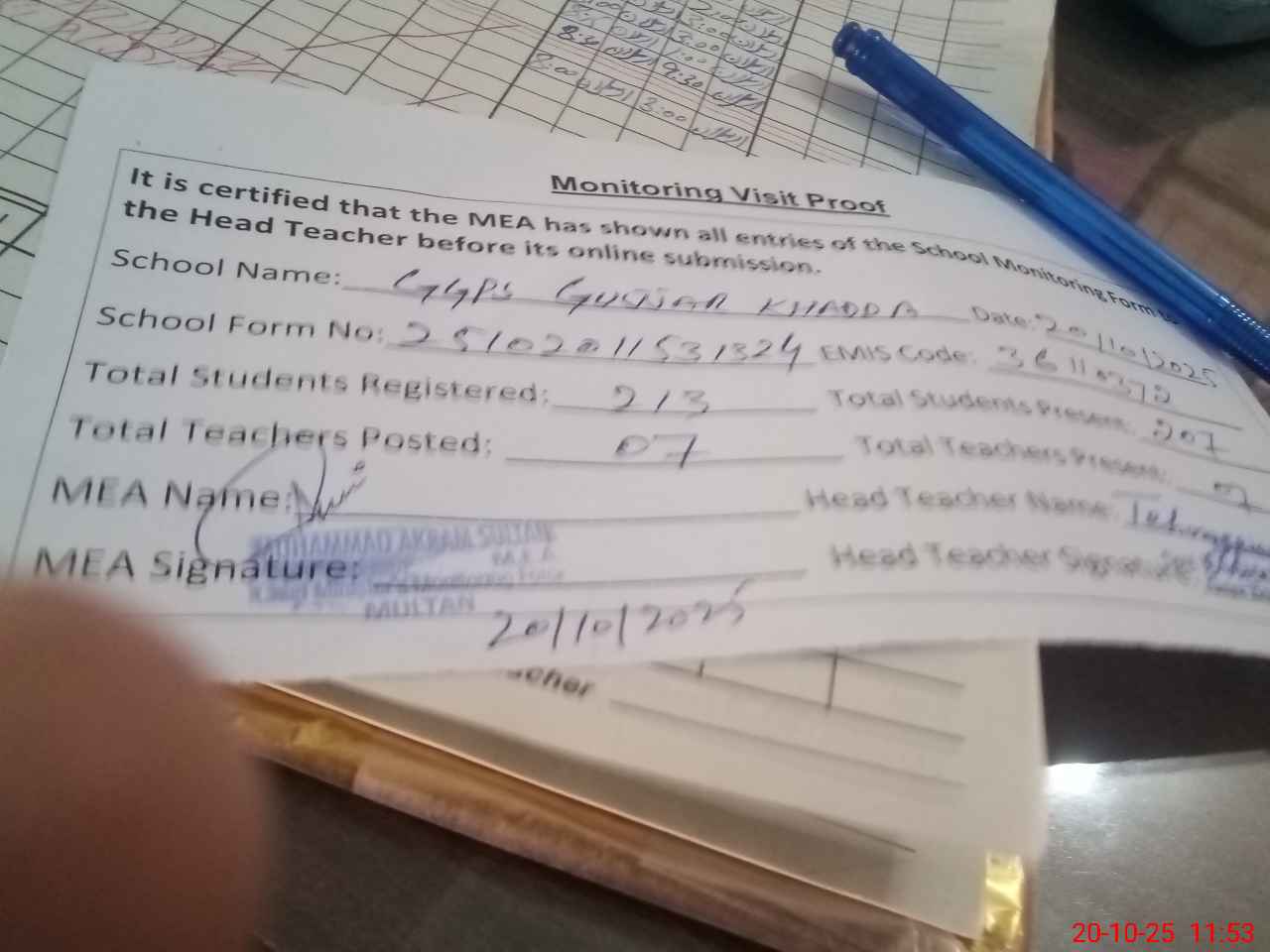 | Attendance Register | Head Teacher | MEA with School | Visit Proof |