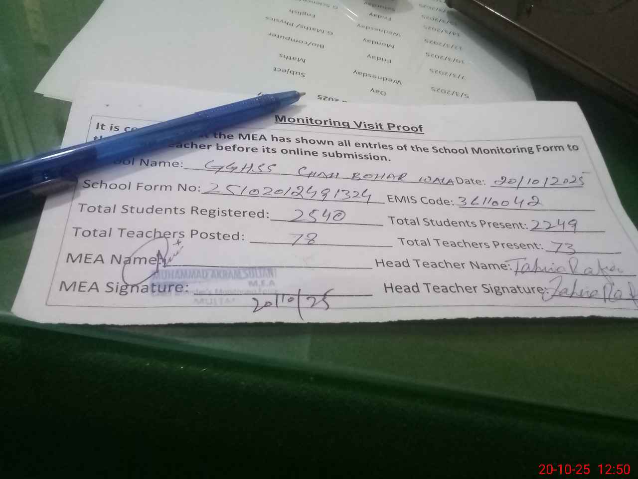 | Attendance Register | Head Teacher | MEA with School | Visit Proof |