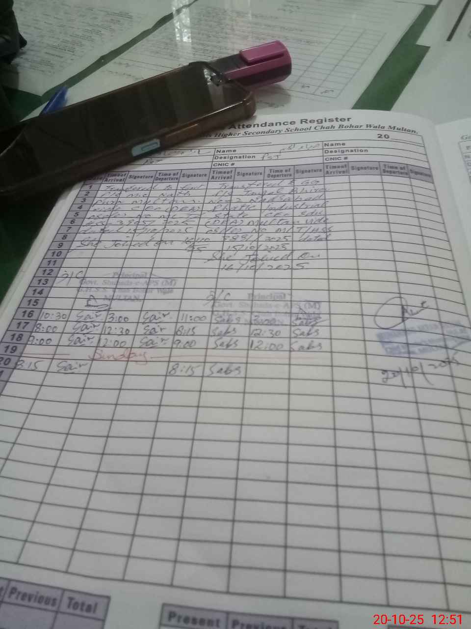 | CNIC | Full Name | Designation | R/C | Absence during last cal. month |