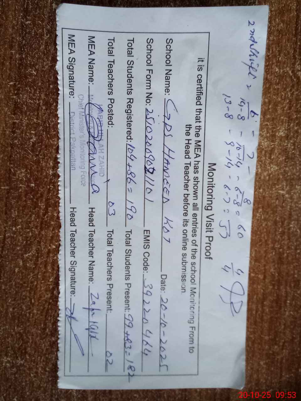 | Attendance Register | Head Teacher | MEA with School | Visit Proof |