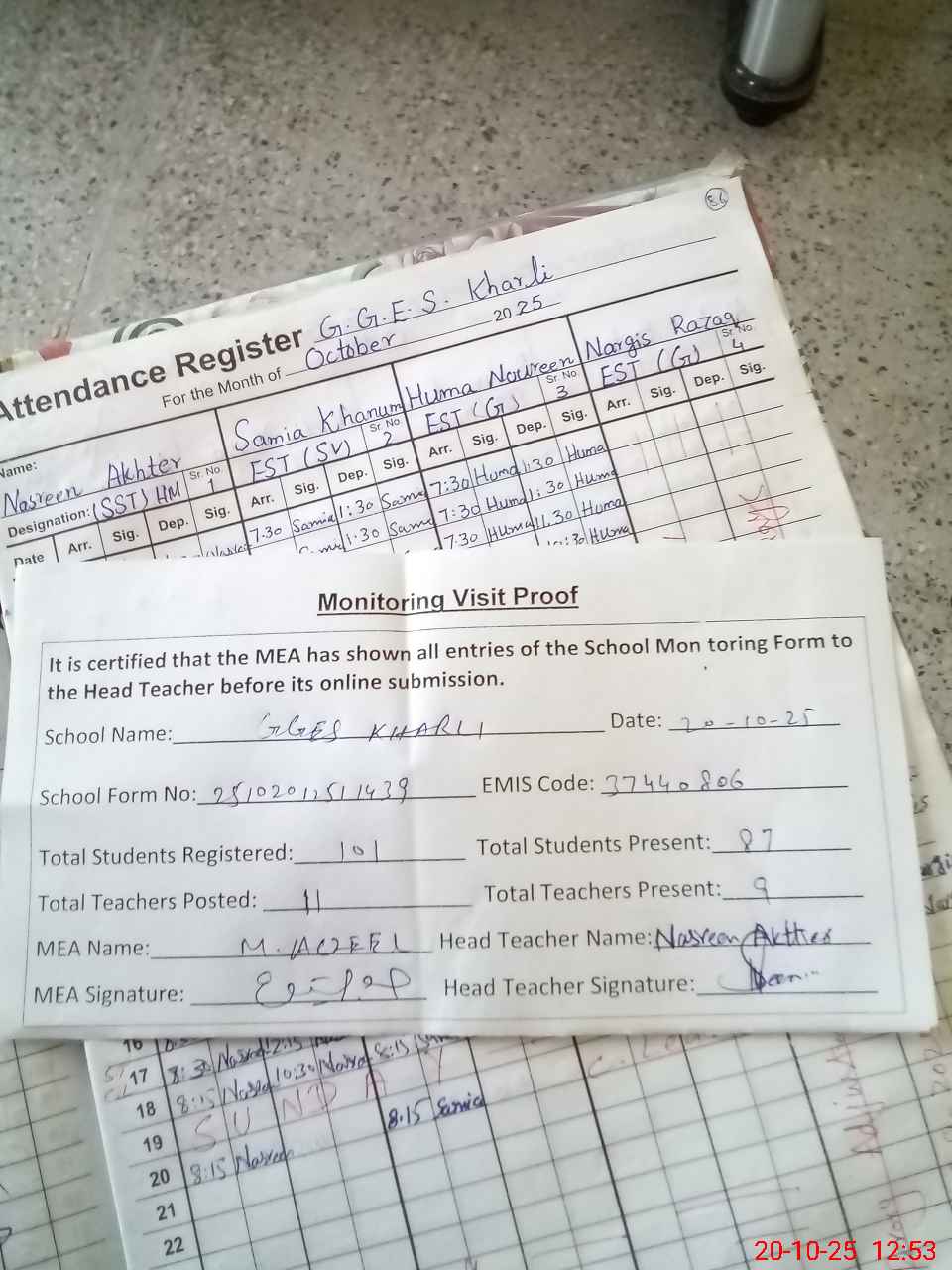 | Attendance Register | Head Teacher | MEA with School | Visit Proof |