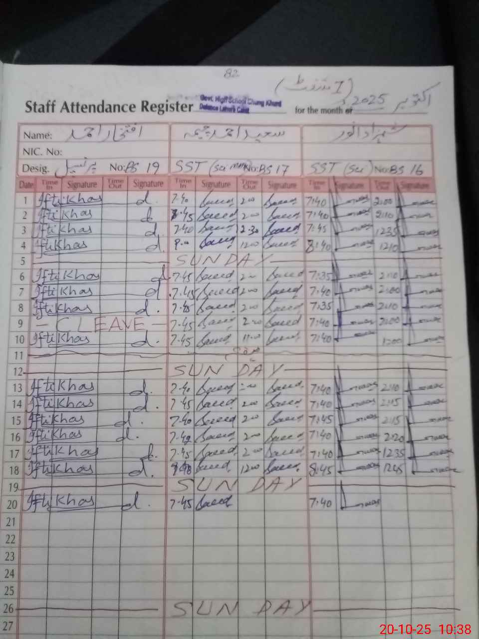 | CNIC | Full Name | Designation | R/C | Absence during last cal. month |