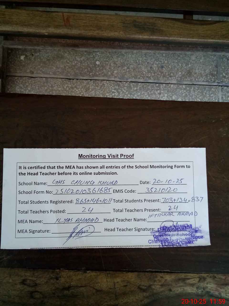 | Attendance Register | Head Teacher | MEA with School | Visit Proof |