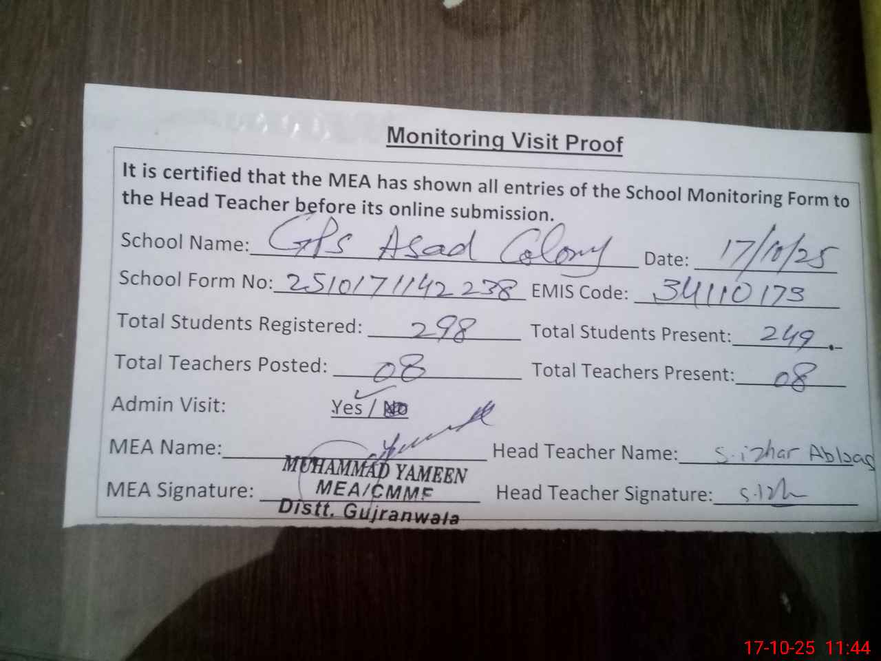 | Attendance Register | Head Teacher | MEA with School | Visit Proof |