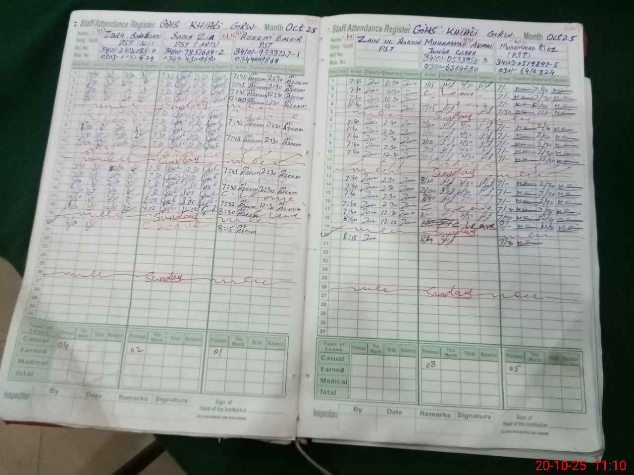 | CNIC | Full Name | Designation | R/C | Absence During Last Calender Month |
